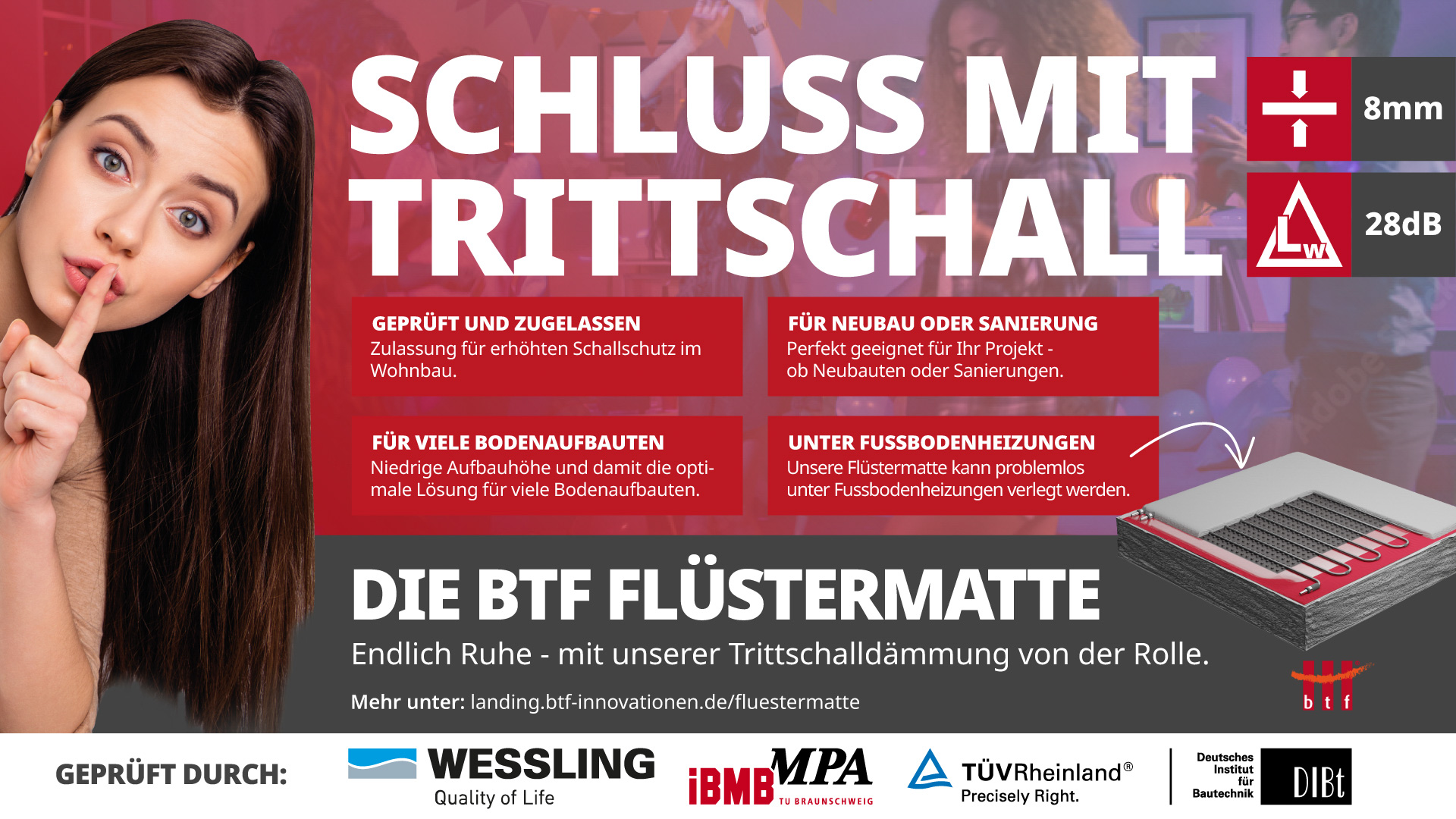 Systemlösung Holzbau Die Revolution im Holzständerbau. Der Holzständerbau ist nachhaltig, schnell und schafft ein einzigartiges Wohnklima. Doch eine Herausforderung bleibt: der Trittschall. Hier kommt die Antwort, auf die der moderne Holzbau gewartet hat. IDEAL FÜRDEN NEUBAU. Beim Neubau steht die Qualität der Ausführung im Vordergrund. Hier spielt die FlüsterMatte ihre Stärken voll aus. 01 Geprüfte […]
