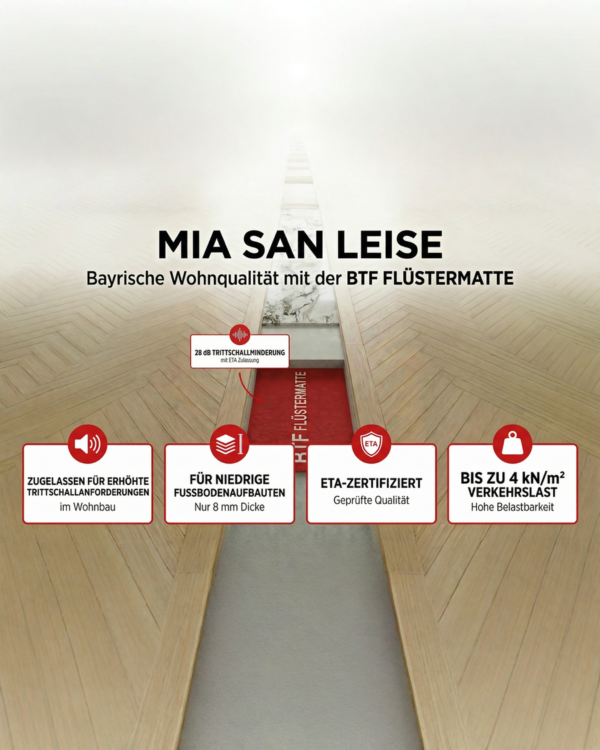 Systemlösung Holzbau Die Revolution im Holzständerbau. Der Holzständerbau ist nachhaltig, schnell und schafft ein einzigartiges Wohnklima. Doch eine Herausforderung bleibt: der Trittschall. Hier kommt die Antwort, auf die der moderne Holzbau gewartet hat. IDEAL FÜRDEN NEUBAU. Beim Neubau steht die Qualität der Ausführung im Vordergrund. Hier spielt die FlüsterMatte ihre Stärken voll aus. 01 Geprüfte […]