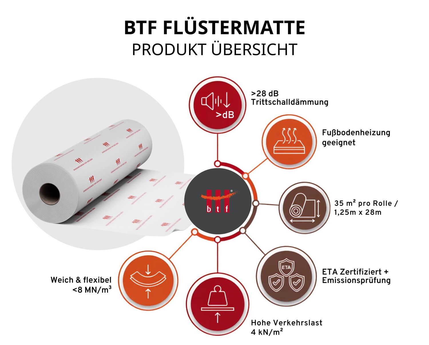 Die BTF FLÜSTERMATTE 8 MM OHNE TRENNLAGE besteht aus einem Spezial-Polyestervlies. Die Trittschallbahn wird auf einer Rolle geliefert und ist somit sehr schnell und einfach zu verlegen. Das Produkt ist vom Deutschen Institut für Bautechnik zugelassen und wird intern und von akkreditierten Prüfinstituten regelmäßig überwacht.
