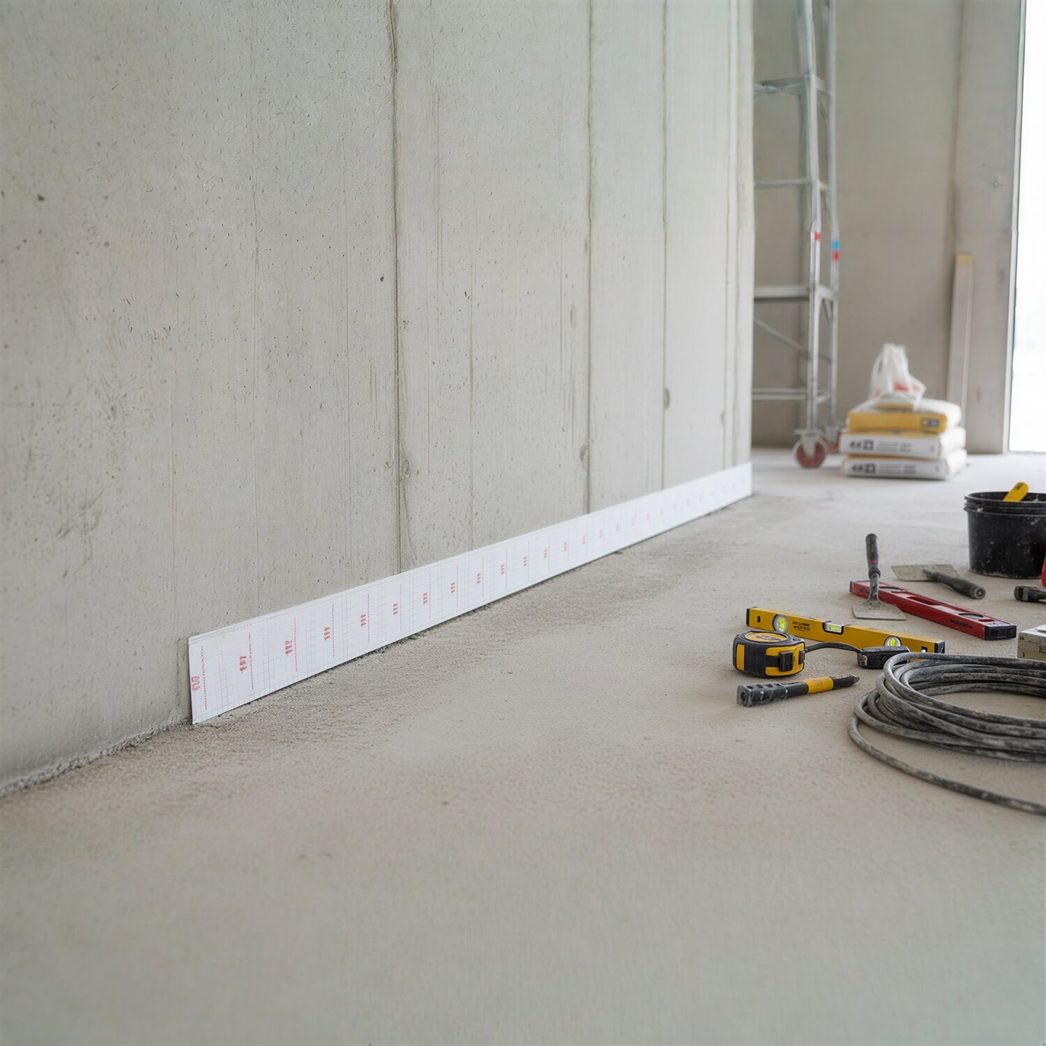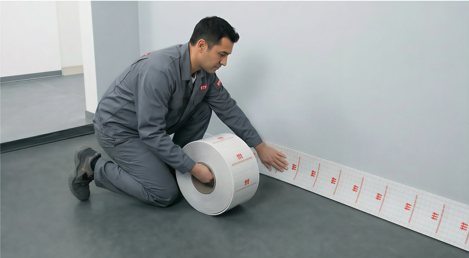Randdämmstreifen aus dem Material der ETA zugelassenen BTF FLÜSTERMATTE 8 mm zur schallbrückenfreien Trennung von Estrich und aufgehenden Bauteilen