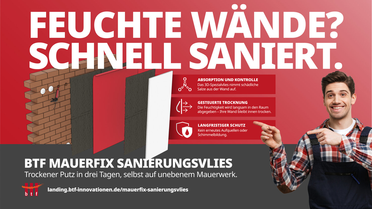Wenn andere Sanierungs- und Trockenlegungsverfahren an ihre Grenzen stoßen, entfaltet BTF seine Stärken. Unsere innovative Putzträgermatte bietet ein einfach anzuwendendes System, das keine Spezialwerkzeuge erfordert und bereits nach drei Tagen sichtbare Ergebnisse liefert.