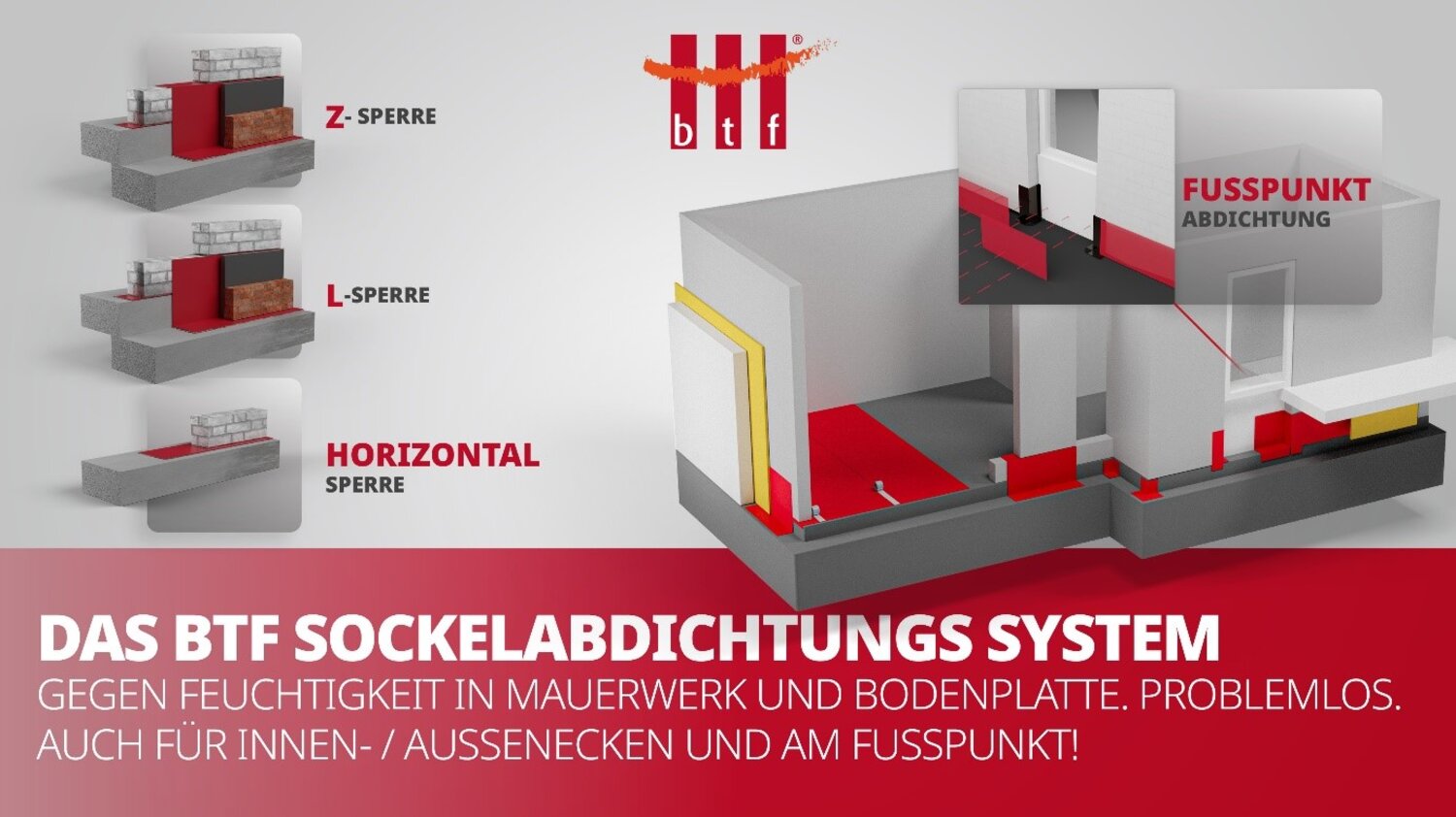 - Die Sockelfläche ist zuvor mit dem BTF SYSTEM SPEZIALPRIMER/KLEBER LF NEW oder BTF SYSTEM SPEZIALPRIMER/DÄMMPLATTENKLEBER nach Herstellerangabe zu grundieren.